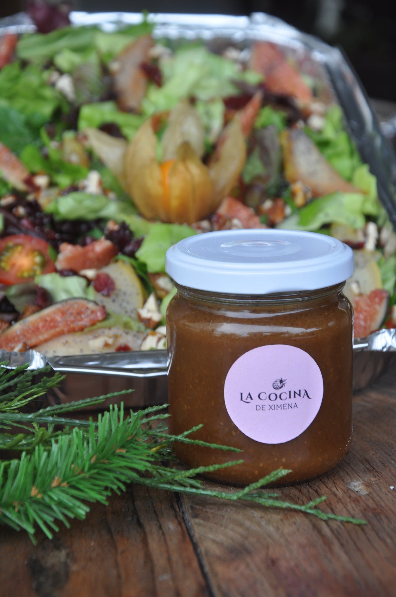 Viene con un aliño de mostaza Dijon, miel de abeja, vinagre balsámico y aceite de oliva (frasco 200 ml.)