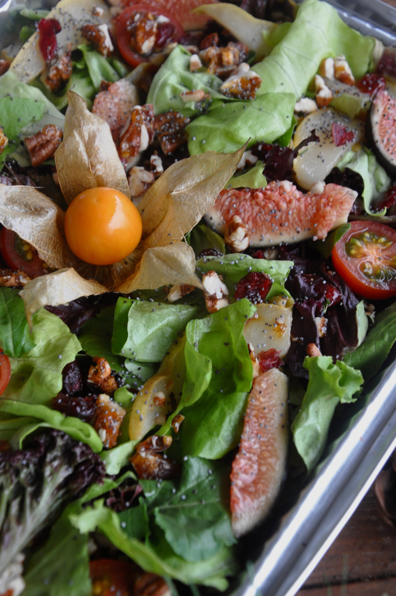 DESCRIPCIÓN: Mix de hojas verdes, moradas y arúgula! Es una belleza y riquísima! También tiene tomates cherry, praliné, cranberries, higos y peras salteadas con un toque de oporto.
